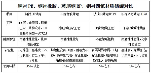 12、全塑PE儲(chǔ)罐或鋼襯塑PE/PO儲(chǔ)罐可盛裝的化學(xué)品非常廣泛,可用于無(wú)機(jī)酸、有機(jī)酸、無(wú)機(jī)堿、有機(jī)堿和有機(jī)化合物。但不宜盛裝濃硫酸、濃硝酸等強(qiáng)氧化劑,能使PE溶脹的芳烴、鹵代芳烴等溶劑。